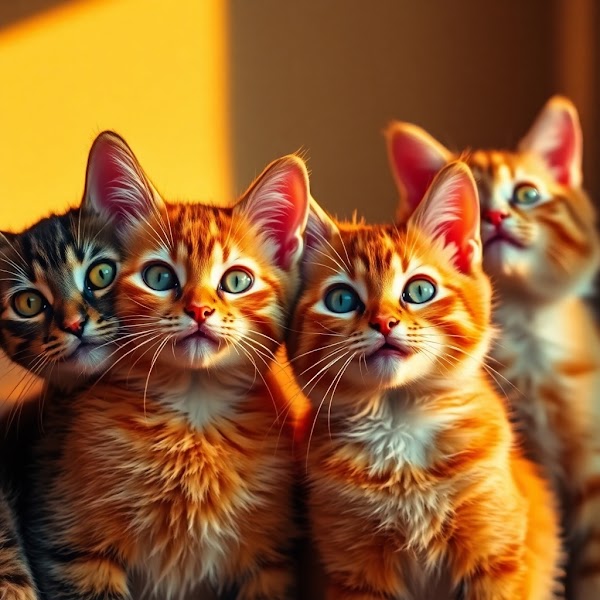 Professional photograph of adorable cats in vivid electric colors, bathed in warm golden hour light, exhibiting soft contrast and saturation, styled in a fine art manner with warm, slightly dark, soft tones reminiscent of Associated Press e.jpg