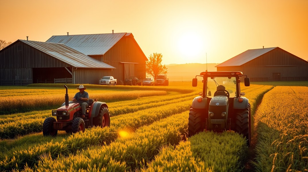Professional photograph, warm golden hour lighting with a warm golden glow. Focus on farming details green fields, hardworking farmers, rustic barns, moving tractors, swaying wheat, and abundant harvest. Soft, elegant style.jpg