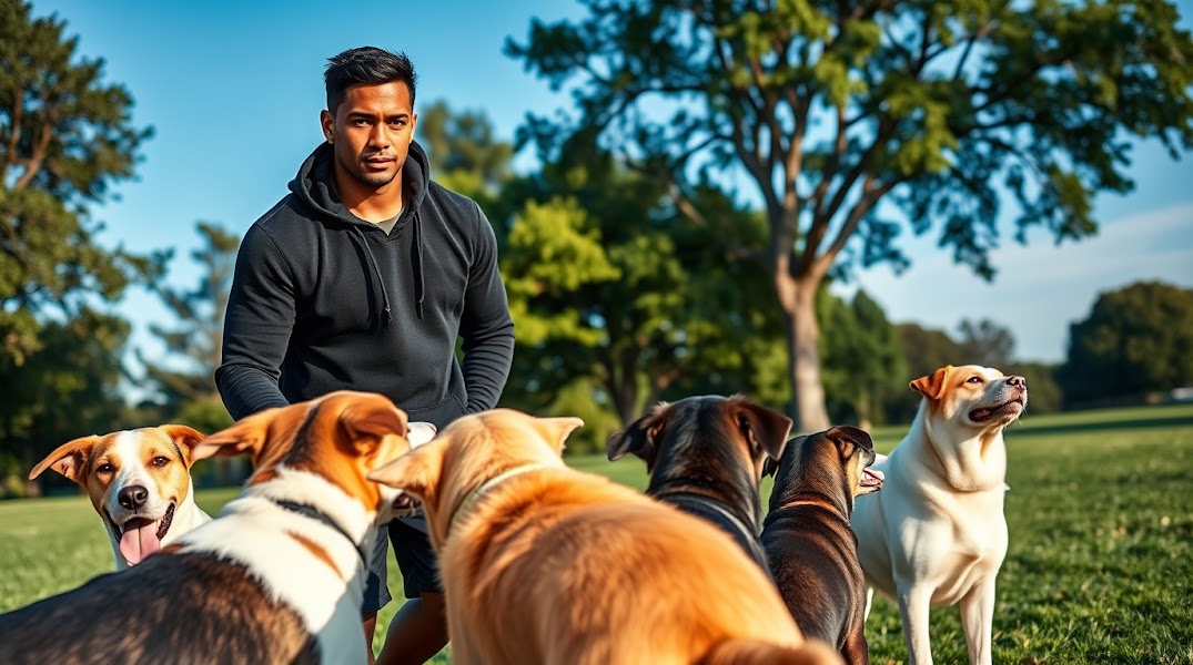 Professional photography, fine art aesthetic, warm with soft shadows. Athletic man, dark complexion and intense eyes, trains five dogs in a vibrant green park. Blue sky, trees form a backdrop. Man in a dark hoodie and shorts. Dogs respond.jpg