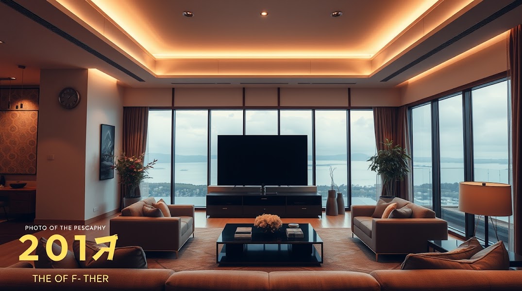 Professional photography, fine art style, warm yet slightly dark tones, soft pastel colors, gentle soft light, diffused shadows, subtle illumination. Depicts a luxurious living room interior with a large screen TV and expansive view, elega.jpg