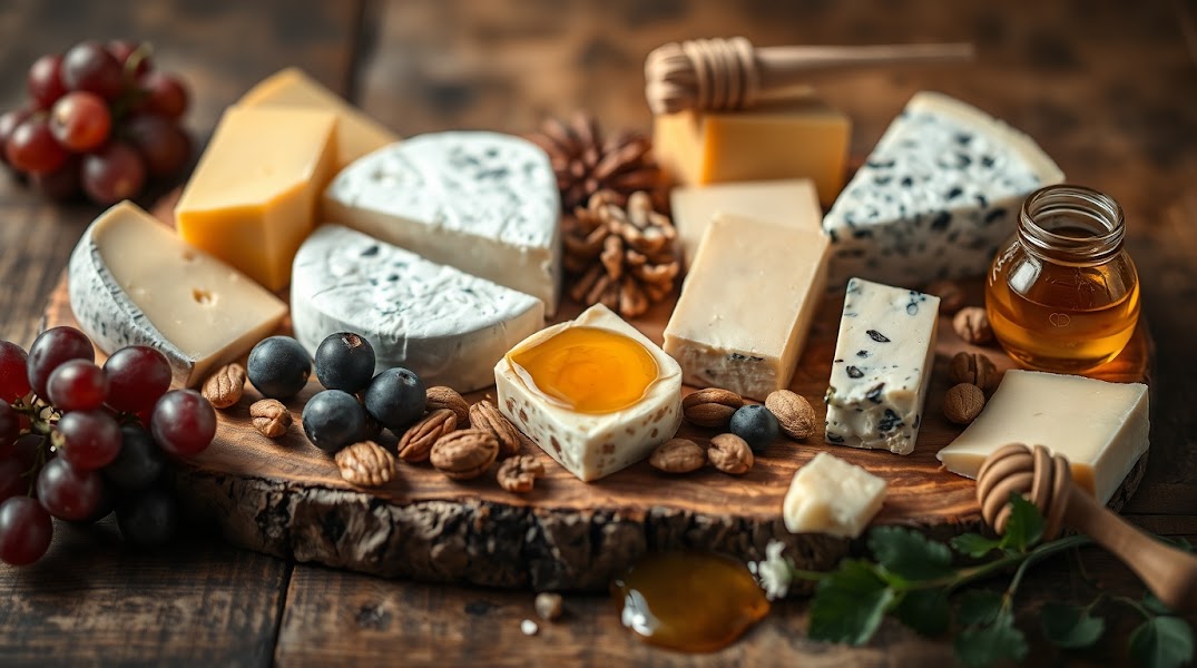 Professional photography in a fine art style, warm with soft, gentle light and subtle shadows. The image features a rustic wooden board laden with cheddar, brie, gouda, and blue cheese, surrounded by grapes, nuts, and honey. The overall aes.jpg