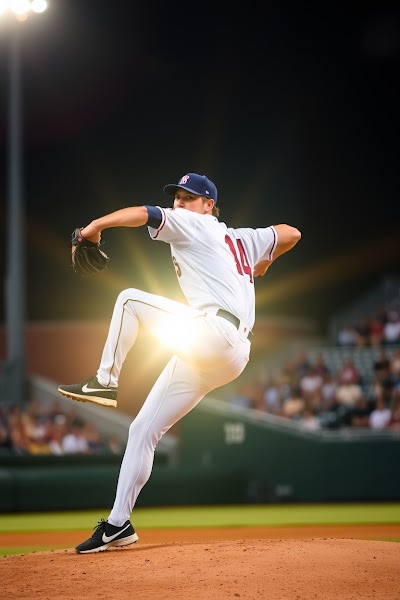 Professional photography, warm tones, soft pastel colors, bright lens flare, a baseball pitcher in motion, intense focus on the release, stadium lights, soft contrast, gentle and soothing, Photo of the Year aesthetic.jpg