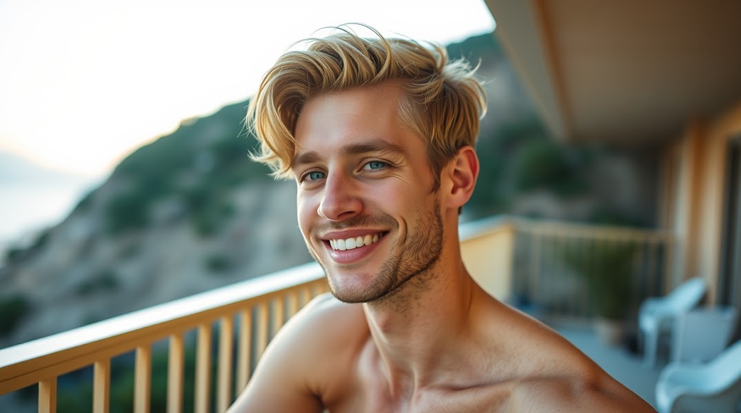 Professional photography with a fine art aesthetic. A man with light blonde hair, styled with natural, carefree waves and slightly faded sides, smiles casually on a bright balcony. The image has warm, slightly dark, soft lighting. Soft cont.jpg
