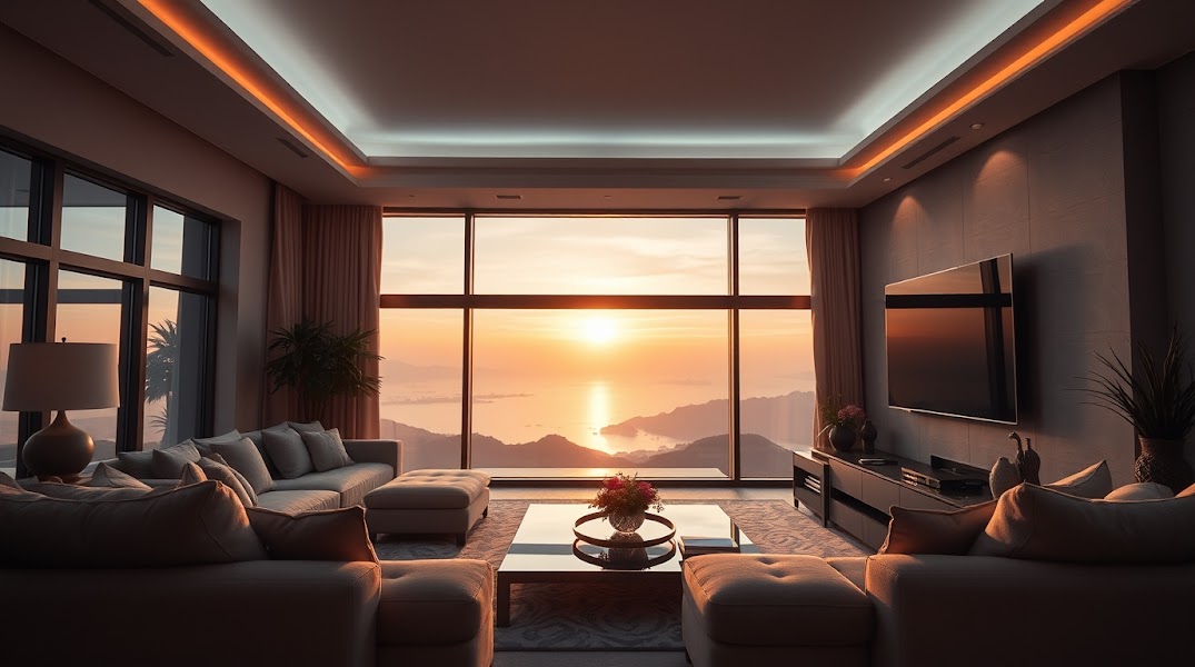 Warm, slightly dark, soft-lit professional fine art photograph of a luxurious living room interior. Pastel colors, large screen TV, expansive view, diffused shadows, subtle illumination, graceful elegance, and refined details. Associated P.jpg