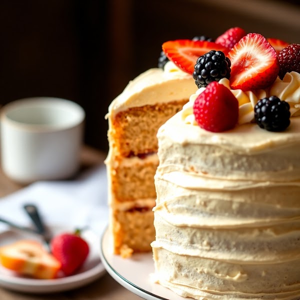 Warm-toned, professional photograph of a multi-layered cake with buttercream frosting and fresh fruit. Delicate piping details are visible. A slice is missing, showing the cake’s moist interior. Soft lighting and a blurred background creat.jpg